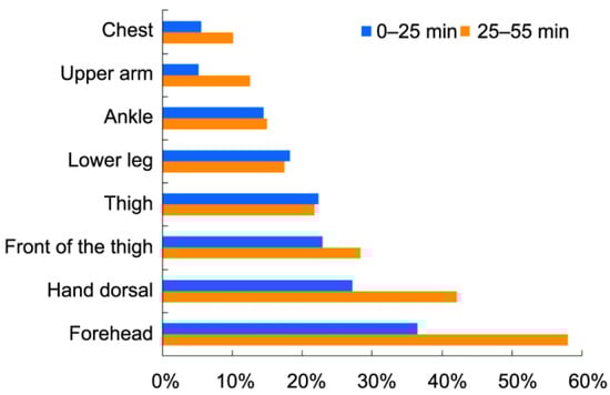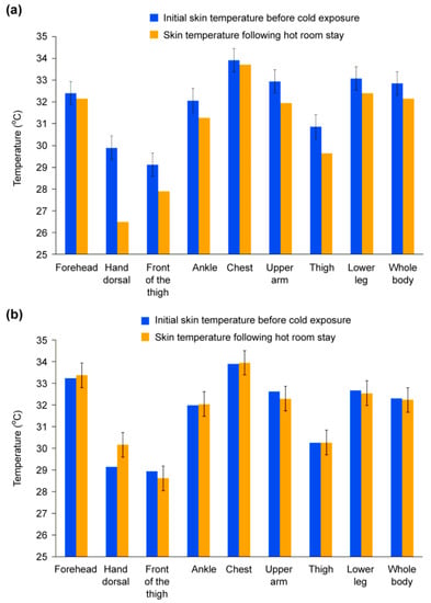- When participants engaged in moderate activity levels entered the hot room following cold exposure, the distribution of the mean body-part skin temperatures was in the order forehead > hand dorsal > front of thigh > thigh > lower leg > ankle > arm > chest.