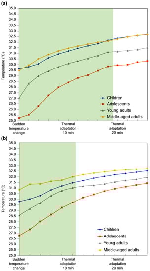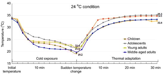 - With the temperature of the cold room remaining unchanged, the greater the temperature difference, the shorter the time required for mean skin temperatures to reach equilibrium. When the temperature difference exceeded 30 °C, the mean skin temperature of the human body required a shorter time to reach a steady state and adapt to the new environment. Among the different age-groups, when entering the cold room from the hot room, the forehead temperatures of the children and middle-aged adult groups dropped most rapidly. After returning to the hot room, the skin temperatures of the children returned to the original levels within the shortest amount of time. Overall, in public places, such as shopping malls, the responses of different age-groups to sudden temperature changes differ. The business directions of shopping malls lack different target consumer groups; therefore, the ideal environmental temperatures differ.