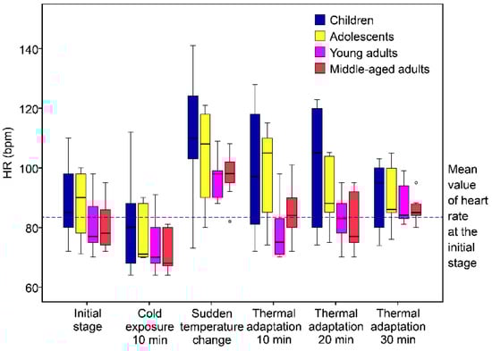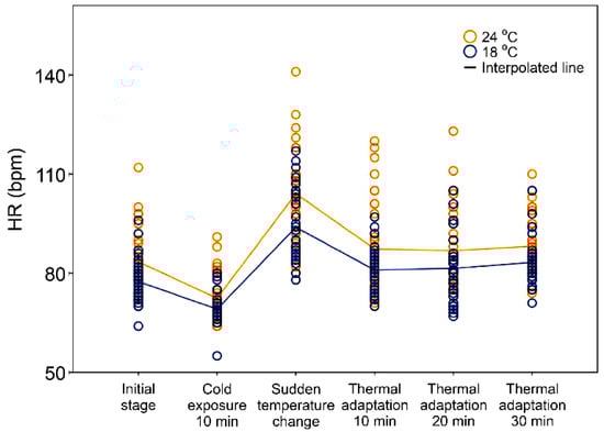 - During sudden temperature changes, the HRs of participants varied significantly. Once they had adapted to the environment, participants’ HRs gradually stabilized, with the degree of temperature differences playing a determining role. Under the 24 °C condition, the HR variation of the middle-aged group was significantly higher than that of all other groups, whereas the range of HR variation in the children’s group was larger, indicating that when the temperature differences exceeds 36 °C, age has a certain influence on HR.