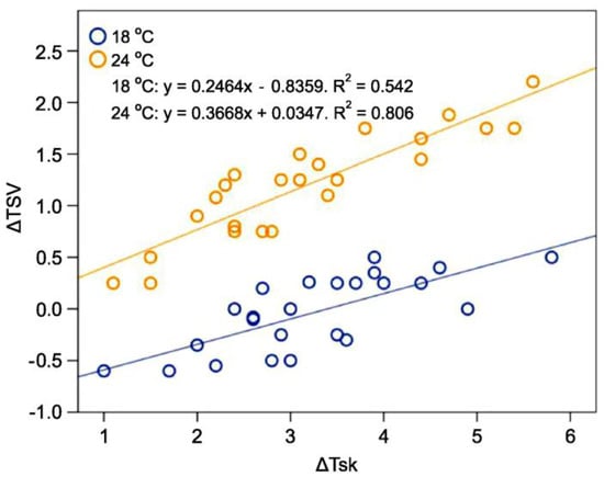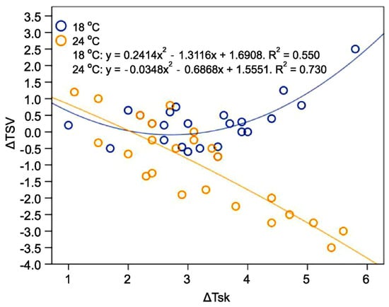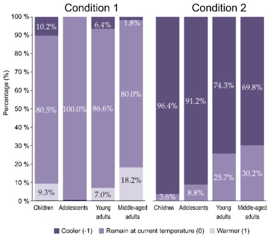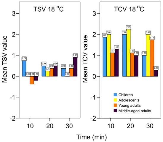 - Following 30 min of thermal adaptation under the 18 °C condition, the middle-aged group reported a moderate feeling in TCV, but a “slightly warm” feeling in TSV, indicating a preference for a slightly warmer room temperature than other age-groups. For the 24 °C condition, all participants voted for a “warm” feeling in TSV and discomfort in TCV.