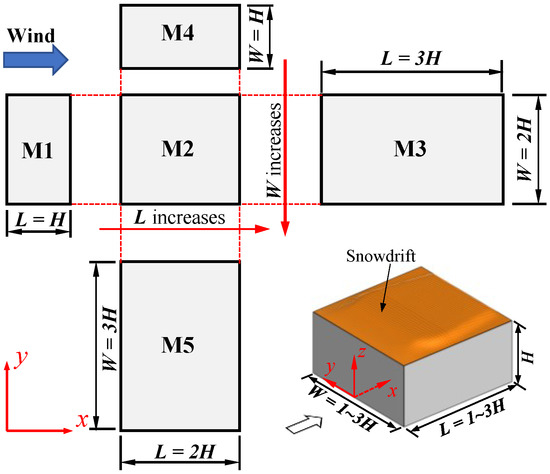 In the present study, the snowdrift model was formed on the flat-roof buildings under the velocity conditions of , as used in previous wind tunnel tests, they were considered to be in a stable form, and different aspect ratios of the low-rise building were considered. In contrast, the building model without snowdrift was used as a control. Table 1 provides some descriptions of the model cases. For conciseness of discussion, a notion of ‘M 1_N’ is used to denote the No Snow case for model 1, and so on for all other building models.