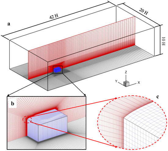 This paper used a computational domain size of , as shown in Figure 3. The distance from the windward face to the inlet boundary was about 10 H, while 9 H was set from the lateral and top boundary to the model face. The leeward face to the outlet boundary was approximately 30 H. The blockage rate met the relevant requirements, which satisfied the requirements of the relevant CFD guidelines [35,36].