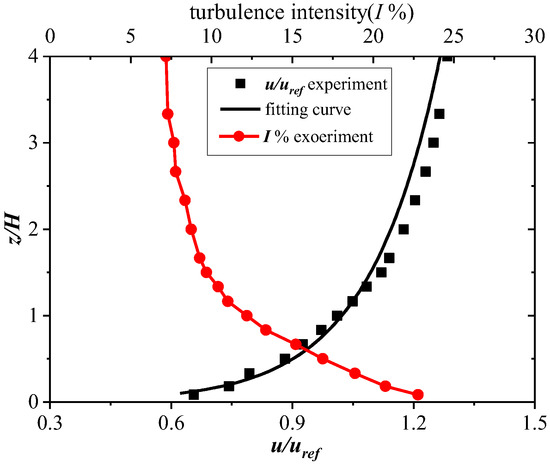 The inlet condition of the numerical simulation was consistent with previous PIV wind tunnel experiments [2] to conveniently verify the validation of the numerical method. The measured profile of the oncoming wind information is shown in Figure 4, where the mean streamwise velocity is fitted by the log law as follows: