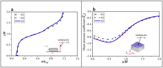 In the present sensitivity analyses, Model 2 without snowdrift was considered to be a reference, and a streamwise mean velocity () of x/H = 2.5 and the mean pressure () on the roof center (y/H = 0.0) were used as the physical quantities analyzed. Three different refined grids (G1, G2, G3) were tested, and their detailed information is presented in Table 2. Figure 5a,b depict the results of the grid resolution tests. As shown in the comparison of the streamwise mean velocity and the mean pressure coefficient, the results of the coarse grid and medium value are quite different, while there is only a relatively small difference between the fine and basic grids. Specifically, for the distribution of the mean wind pressure in the separation–attachment region of the roof, the numerical results between the coarse and medium grid are significantly different. Thus, compared with fine and coarse grids, the medium grid can provide a good compromise.