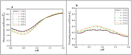 The description of turbulence characteristics is usually based on statistical samples, so statistical sampling time is an important parameter affecting the statistical results. The analysis of the sampling time was conducted using the medium grid, and the effects of the different sampling times of 1.0 s, 2.0 s, 3.0 s, 4.0 s, 5.0 s, and 6.0 s on the numerical results were examined, respectively. As shown in Figure 6, taking the results of 6.0 s as a reference, the comparisons of the mean pressure and the fluctuating pressure coefficient on the roof’s central axis under different sampling times are depicted. As one can see, with the increasing sampling time, the statistical value of the wind pressure coefficient tends to stabilize gradually. It indicates that the statistical value of the variables will hardly change after the sampling time exceeds 6.0 s. Therefore, the final statistical sampling time was determined to be 7.0 s in the present LES calculations.