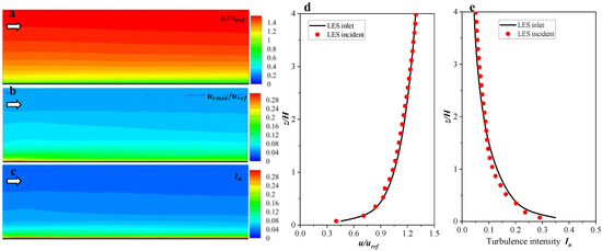 Self-preservation test of oncoming flow in LES calculation (a–c) Contour maps for , , at xoz planer; (d,e) Quantitative comparison for and at location of inlet and incident).