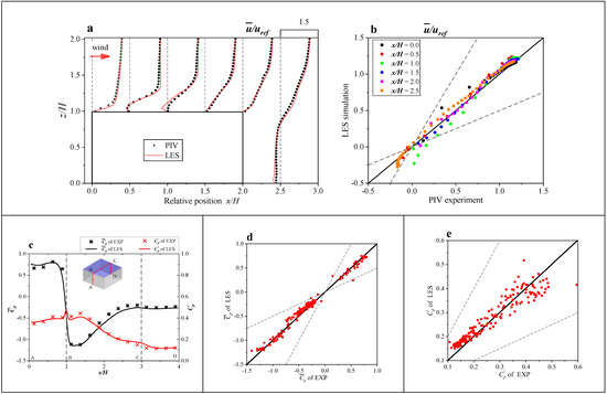 Figure 8a shows that the distribution of the mean streamwise velocity is quantitatively compared at the positions of x/H = 0.0, 0.5, 1.0, 1.5, 2.0, and 2.5, which shows that the numerical results from the LES are consistent with the PIV experiments. Meanwhile, from the quantitative comparison in Figure 8b, it is found that the compared point pairs are almost clustered around the ideal line of a 1:1 relationship. This indicates that the LES method adopted in the present study can accurately predict the mean velocity field. The comparisons of the time-averaged and standard deviation wind pressure are depicted in Figure 8c–e, where the wind tunnel experiments from Tokyo Polytechnic University [36] were used as a validation database. Figure 8c shows the distributions of the wind pressure coefficients along the middle axis of the roof, and Figure 8d,e show the corresponding quantitative comparisons of the time-averaged and STD pressure coefficients between the LES and wind tunnel experiments. As one can see, the results from the presented LES prediction are consistent with the wind tunnel experiments, although the point pairs of the STD pressure coefficient shown in Figure 8e are relatively scattered around the ideal line. This indicates that the numerical settings of the present LES method are suitable for predicting accurate numerical results, and it is well verified by comparing them with the previous wind tunnel experiments.