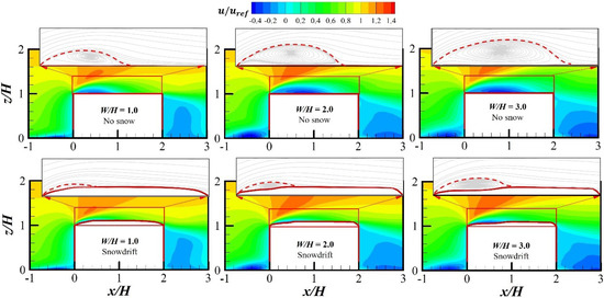 Figure 9 depicts the distributions of the time-averaged streamwise velocity and streamlines at the xoz planer for some typical models with or without snowdrifts. The red-dotted lines in the contour map represent the separating streamlines, which can be calculated by . The area enclosed by the separation line and the roof surface can reflect the size of the separation bubble, and the intersection of the separation line and the roof at the rear is the average reattachment point. As shown in Figure 9, it is evident from the figures that the size, both the vertical and streamwise extents, of the mean separation bubble grows monotonically as the windward width increases, which coincides with the findings of previous research [41]. However, the existence of a snowdrift significantly affects the distribution of the velocity field and the shape of the separation bubbles on the roof. As one can see, there is an obvious negative velocity above the roof when there is no snow, and the highest point of the separation line is farther away from the roof; the size of the separation bubble is larger than that of the snowdrift case. However, the negative velocity above the roof almost disappears for snowdrift cases, and the separation bubble becomes smaller and closer to the roof surfaces. Thus, it can be inferred that the snowdrift will accelerate the passing velocity over the building roof.
