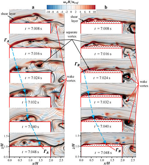 To better analyze the influence of snowdrifts on the flow field, the direct approach is used to compare the instantaneous flow feature above the roof with or without snowdrifts. In this section, M2 will be taken as a reference, and the instantaneous flow feature at the xoz planer will be compared and analyzed. As shown in Figure 10, the figures depict the instantaneous streamlines and vorticity field of six different instants from t = 7.008 s to t = 7.048 s for the No Snow and Snowdrift model, respectively. In these figures, attention is directed to the flow structures in the separation bubble on the roof. At the front end of the roof, the vorticity has a larger magnitude, which is caused by the formation of the separated shear layer when the oncoming flow flows through the sharp edge of the roof, and the fluid element in the separated shear layer has high shear deformation. Notably, this kind of high-shear flow has significant instability [42]. According to the related turbulence theory, the high-shear effect of fluid is the internal factor of the transition from laminar flow to turbulence flow, which provides the energy source for vortex generation. Thus, a series of vortices are formed in the separated shear layer, then travel and grow up on the roof, and finally slowly dissipate in the flow field. However, the snowdrift on the roof results in a remarkable difference in the vortices’ movement. When there is no snow on the roof, take vortex as an example for analysis. At t = 7.016 s, vortex is detached from the leading edge of the roof. From t = 7.06 s to t = 7.032 s, vortex is stretched and convected downstream along the building roof. During this process, the high shear–strain fluid in the shear layer continuously provides the energy for the generation of vortices, and the generation of turbulence energy is much larger than that of dissipation. Meanwhile, the merging of several neighboring vortices in the separation bubble can also be observed; thus, the size of vortex on the roof will gradually increase. From t = 7.032 s to t = 7.048 s, the large vortex transforms into a small vortex in this process, and the scales of the vortices decrease gradually. The vortex moves from the farthest position of the vortex core of the roof to reattaching to the roof and is finally dissipated in the wake behind the roof.