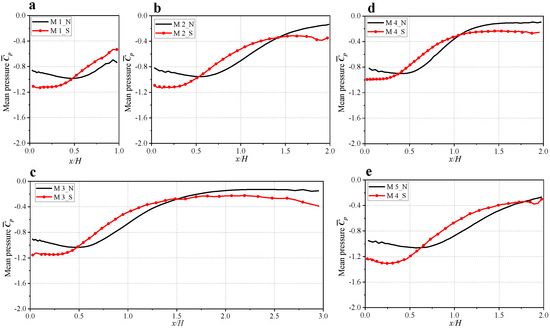 The distributions of mean pressure coefficient () along the roof axis ((a) M1; (b) M2; (c) M3; (d) M3; (e) M4).