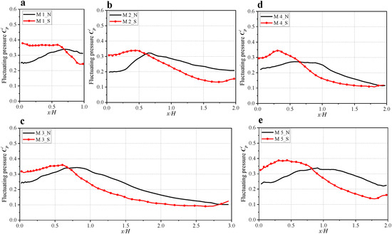The distributions of fluctuating pressure coefficient () along the roof axis ((a) M1; (b) M2; (c) M3; (d) M3; (e) M4).