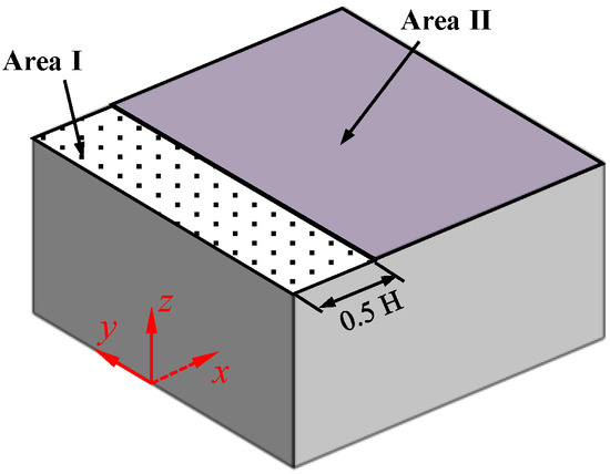 As shown above section, the snowdrift on the roof will cause an obvious difference in wind pressure, especially in the windward region of the roof. Thus, the area-averaged pressure coefficient in the windward region will be discussed in this section. Figure 13 depicts the schematic diagram of the roof division, where Area I denotes the windward region with a range of 0 < x/H < 0.5, and Area II denotes the non-windward region with a range of x/H > 0.5. Here attention is directed to the area-averaged pressure coefficient in the windward region, and the analysis variables include the area-averaged value of the mean, standard, and minimum pressure coefficient in the windward region. Taking variable as an example, the area-averaged value of can be expressed as follows: