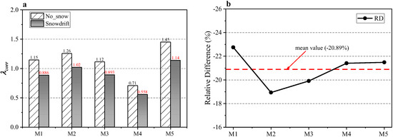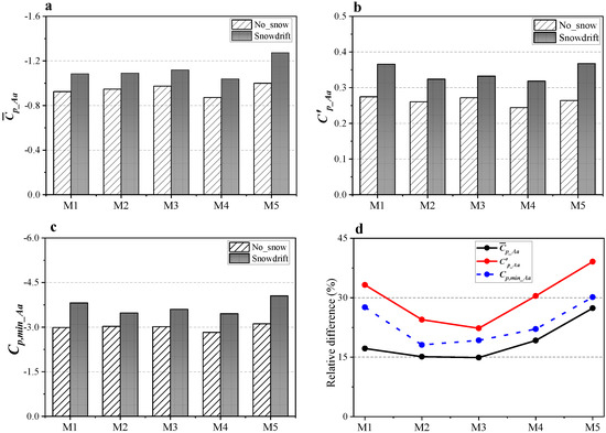 where, denotes the peak gust factor, and in the present study, was selected. As shown in Figure 14, the comparison of the area-averaged value of the wind pressure coefficient for roofs with or without snowdrift is depicted. It can be seen that the magnitude of the Snowdrift cases is significantly larger than that of No Snow cases. Taking the area-averaged standard pressure coefficient as an example for analysis (Figure 14b), the values of all models are less than 0.3 without snow, and greater than 0.3 with snow, even more than 0.35 for M5. To quantitatively describe the effect of snowdrift on the area-averaged pressure coefficient, Relative Difference (RD) was introduced: