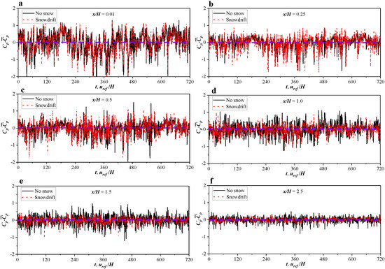 From the analyses compared with the airflow characteristics in Section 4.1, the reason can be deduced as follows: when there is no snow, a typical and large-scale separation bubble will form on the roof after the oncoming flow separates from the leading edge of the roof, and the vortex core will be far away from the separation point and the roof surface. Thus, the mean wind pressure in the windward region for the No Snow roof is smaller than that of a Snowdrift. However, the snowdrift causes the separation shear layer to be closer to the roof surface, and the recircle space is reduced; thus, the reattachment effect is weakened. As a result, the size of the separated vortex is significantly reduced, and its position is earlier and closer to the model surface. Therefore, in the region of x/H < 0.5, the separated vortex closer to the snowdrift roof surface will result in a larger magnitude of the time-averaged and STD wind pressure coefficient. In the region of x/H > 0.7, the large-scale separated vortices formed on the No Snow roof slowly dissipate, and it has a greater impact on the STD wind pressure. However, the small-scale vortices formed on the Snowdrift roof will be more easily dissipated due to the wall friction, so the corresponding STD pressure coefficient for the Snowdrift roof will also be reduced.