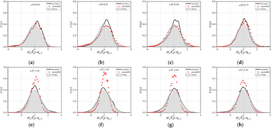 Figure 16 depicts the PDF of the fluctuating pressure coefficient at the different monitoring points, where the abscissa is the dimensionless fluctuating wind pressure coefficient. denotes the standard deviation of the fluctuating wind pressure coefficient at the monitoring point without a snowdrift, and the grey filling part represents the standard normal distribution (or Standard Gaussian distribution). For the convenience of subsequent analysis, the interval of is defined as the low-fluctuation range of the fluctuating wind pressure, and the intervals of < −2 and > 2 are defined as the negative and positive high-fluctuation ranges, respectively.