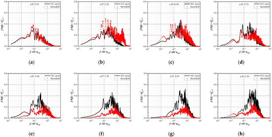 The power spectrum of the fluctuating wind pressure can be obtained using a Fourier transformation of the time history data to analyze the influence of snowdrift on the energy distribution of the fluctuating wind pressure in the frequency domain. Figure 17 depicts the PSD of the fluctuating pressure at different monitoring points on the roof, where f denotes the frequency and represents the variance of fluctuating pressure at the monitoring point without snowdrift. At the point of x/H = 0.01 near the leading edge, the predominant frequency corresponding to the peak values of PSD of the fluctuating wind pressure are all located in the low-frequency range (). The low-frequency fluctuation is mainly caused by the K-H instability in the high-shear flow near the leading edge of the roof [42]. Meanwhile, the K-H instability in the shear layer will transfer turbulence energy to the flow field by the intermittent ‘flapping motion’, thus inducing vortex generation [44]. As the airflow goes downstream in the separating shear layer, the vortex energy is continuously accumulated, and the spectral peak values of the fluctuating wind pressure will tend to increase. Meanwhile, the predominant frequency of each monitoring point also increases gradually. This is because the large-scale vortices formed in the shear layer will transform into small-scale vortices in the traveling process, which causes the vortex energy to transform from low frequency to high frequency.