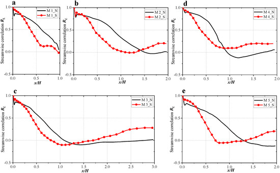 Comparison of streamwise correlation ((a) M1; (b) M2; (c) M3; (d) M3; (e) M4).