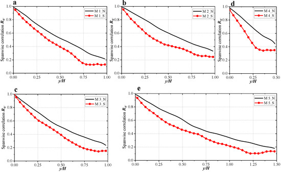 Comparison of spanwise correlation ((a) M1; (b) M2; (c) M3; (d) M3; (e) M4).