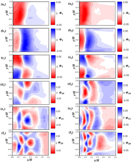 A set of eigenvectors and the corresponding eigenvalue , are introduced to represent the energy contained by each mode, where n denotes the mode’s order. The POD modes are evaluated by solving the maximum of the projection of . Thus, the matrix composed of eigenvectors is the obtained POD modes and the eigenvalue denotes the energy contribution of each POD model. The derivation can be expressed as follow: