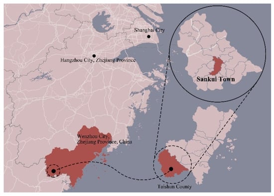 The Taishun Hundred-family Feast culture is located in Sankui Town, Taishun County, Wenzhou City, Zhejiang Province (as shown in Figure 1). Sankui Town is located in the middle of Taishun, is an essential township for trade and transportation, and is the most active area for human activities. The total area of the town is 64.9 km2, with 16 villages and a total population of 23,002. Sankui Town has a comfortable climate all year round, with plenty of rainfall, cool summer and warm winter. The scenery in each season has its characteristics, including freezing fog, the sea of clouds, ice waterfalls, azalea sea, ancient red maple paths and terraced fields, the mountains rolling, the forests lush and rolling, and the ecological environment is stunning.