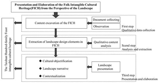 In this study, we aim to explore the cultural connotation of the FICH and extract the elements of landscape design, thus presenting and expressing the FICH using landscape as a carrier, to achieve the conservation and inheritance of the FICH. Therefore, it is necessary to introduce how the content of FICH was collected, how they were extracted for landscape elements and how these extractions were presented for disclosing the results (Figure 2).