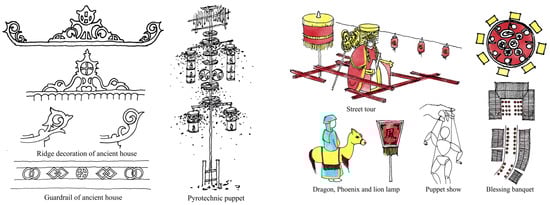 Based on the results of the excavation of the culture of the Taishun Hundred-family Feast, some cultural elements were extracted in terms of patterns, forms and colours for the content of activities, material carriers and spiritual places (e.g., Figure 4). In Zhangzhai village, the most well-preserved is the ancient house of Zhangzhai, the patterns and styles of the ridge decorations and guardrail of this spiritual place were extracted and applied to the landscape design. The pyrotechnic puppet itself is an intangible cultural heritage whose spiritual beliefs are to please and honour the gods and ancestors. The form and structure of the pyrotechnic puppets and their working principles are extracted and used as landscape elements. The street parade is a parade that passes through every street of the village. According to the extracted images, the use of colour is very pure, with each object and costume in red and yellow, while the red lanterns with the word fortune hanging on both sides of the street can better bring out the festive atmosphere, the colours are used to create the colour scheme of the landscape, and the red lanterns with the word of fortune are used to create the atmosphere of the landscape. The dragon and phoenix lion lamps are a performance activity in Taishun’s Hundred-family Feast culture, and their unique shape and colour scheme are applied to the expression of the landscape. The puppet show is also one of the performance activities, extracting the working principle and characteristics of the puppet show which uses silk thread to control the form of the puppets to express the landscape. The bowls and chopsticks, rice dishes, round tables and square chairs of the banquet form a table, while table after table, from the cloth filling the ancient house, the banquet is held in larger and larger numbers, and then extended to the street, to the forms and dishes used in the landscape vignettes.