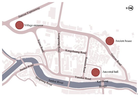 The landscape presentation of the Taishun Hundred-family Feast culture is located in the centre of Sankui town, Taishun County, Wenzhou City, Zhejiang Province, which is the birthplace of Taishun’s Hundred-family Feast culture. The northern end of the site is connected to the Jianxue Line and is the entrance to Zhangzhai village. The interior of the site is bounded by a San Kui stream running north-south through it, with a road on each bank of the stream, Shuguang Road being the one that runs immediately along the riverbank. Yanshui Road is a relatively busy commercial road with shops on both sides, and the two banks are connected by several bridges. Near the east side of Yanshui Road is the Zhangzhai Ancestral Hall, an important site for ritual and cultural worship. There is also an important road to the north and south, Guiyan road, where the street is mostly dominated by spaces inhabited by villagers, including the spiritual and cultural space of the ancient house of Zhangzhai, which is located on the eastern side of Guiyan road. Other roads connect the residents’ daily life spaces and residential spaces (shown in Figure 5).