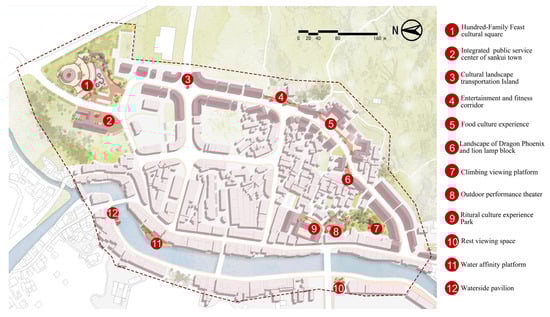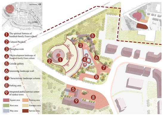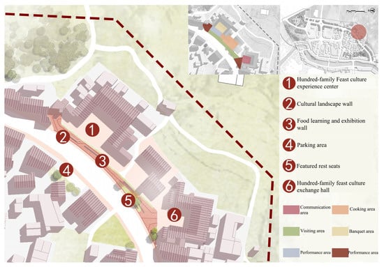 The protection, development and transmission of intangible cultural heritage is an issue of great concern to society. For the wide variety of intangible cultural heritage, it is more meaningful to classify it into special studies []. This study applies the method of landscape presentation of the intangible cultural heritage of folk activities to the case study of the Taishun Hundred-family Feast culture. Through the in-depth excavation of the Taishun Hundred-family Feast culture, the excavation results are classified and analysed, the type of landscape space required for each cultural activity is analysed, and the pattern form, colour, material and text content of the material carrier of the cultural activity are analysed to extract the landscape design and apply it to the landscape structures and the complex expression of the landscape while making full use of the local natural resources and characteristics to fully integrate the spiritual beliefs of culture into the landscape space, which is finally applied to the landscape planning and design of Sankui town centre. Thematic, immersive and interactive landscapes are used to realize the cultural presentation of the Taishun Hundred-family Feast. For each thematic landscape area, different landscape elements and landscape spaces are used as the carrier for the construction of the cultural landscape of the Hundred-family Feast. At the same time, the landscape space carries each activity of Taishun’s Hundred-family Feast Culture, creating a different cultural atmosphere and expressing different spiritual beliefs, thus attracting people to participate to feel and experience the Hundred-family Feast Culture. This also provides new ideas for protecting and developing the intangible cultural heritage and its inheritance. At the same time, it gives and enriches the cultural connotation of the landscape, achieving a mutual promotion effect.