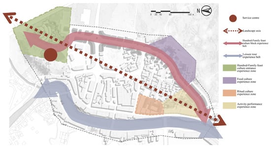 This study created a landscape spatial pattern of “one centre, one axis, two belts and four zones”. The centre is the integrated public service centre of Sankui Town, and the axis is a landscape axis running through the northern and southern ends of Zhangzhai Village, with the northern end connecting the entrance to Zhangzhai Village and the Sankui Town Public Service Centre and the southern end being the convergence point of the two zones. The eastern side favours the experience of Taishun’s Hundred-family Feast culture, while the western side favours the experience of leisurely living. The two belts are the Hundred-family Feast culture block experience and the leisure tour experience along Yanxi, which are two blocks with different experiences. The four zones are four major landscape theme zones. Based on the results of the excavation of Taishun’s Hundred-family Feast culture, the folklore activities of different types and places are divided into themes, namely the Hundred-family Feast cultural entrance experience zone, the food culture experience zone, ritual culture experience zone, and activity performance experience zone (as illustrated in Figure 7).