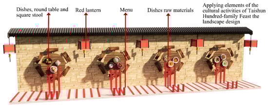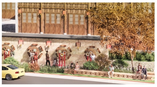 The landscape element carrier in this zone is the dishes display wall that showcases the elements of the Hundred-family Feast culture in the form of a banquet of blessings. The structure of the wall is characterized by the style of ancient local architecture. The dishes in the banquet are modelled and displayed in the form of round tables and benches, and each dish is linked to the paving of how to prepare it. Therefore, it enhances the exploration of the landscape and contributes to the understanding of the food culture of Taishun’s Hundred-family Feast culture (as shown in Figure 10). Furthermore, the spatial carrier for landscape activities in this zone is composed of an internal and external courtyard. The internal courtyard is reasonably divided into the various working areas of the banquet, with a clear division of labour to facilitate the activities of the banquet. The external landscape is located along Guiyan road, not only attracting people who want to learn about food culture but also providing a space for pedestrians to rest and watch. The cultural wall shows the local culinary characteristics and the names of the dishes, and the materials used to make them. Meanwhile, the interactive mobile phone can be used to scan the code to understand the process of making each dish, enhancing the interaction between people and the landscape (as described in Figure 11).