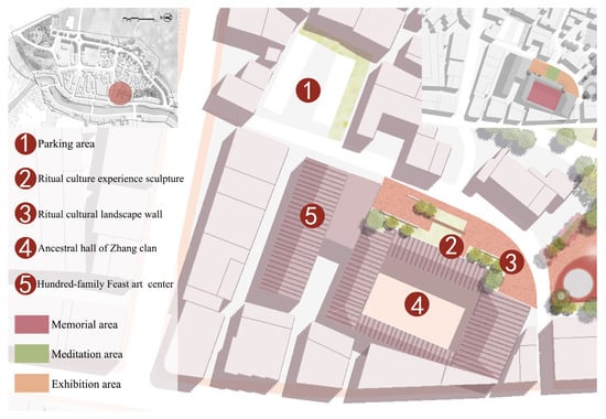 The landscape of the ritual culture experience zone is divided into two parts, an area outside the ancestral shrine bordering the neighbourhood and a ritual space inside the ancestral shrine (as illustrated in Figure 12). The contemplation area is used to tell the story of the culture of spring rituals and the introduction of the ancestors, and the ritual space is used to perform rituals related to spring rituals.