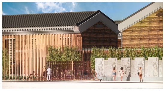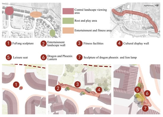 The local cultural story is told to people using landscape design, including the story of the origin of FICH, the development process, and the story of holding folklore activities []. It can be expressed through sculptures, relief patterns, digital virtual scenes, etc. The narrative is completed through successive different activity spaces in the overall spatial structure of the landscape, and different thematic episodes are strung together through the tour route to meet people’s material and spiritual experiences so that people can better accept and understand the cultural connotations through the landscape []. Through the fragmented plot of the story, the landscape space is combined and created using landscape vignettes that match the characteristics of the landscape, triggering people’s emotions and imagination, strengthening the cultural attributes of the landscape and the infectious power of the landscape space [].