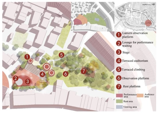 The outdoor performance theatre is mainly used for the performance of activities such as puppet shows, folk music and so on in the Taishun Hundred-family Feast culture. In the centre is a large stage for the performers to take to the stage, with a small space for the performers to rest and prepare for some behind-the-scenes work. The audience is positioned directly opposite the stage, taking advantage of the height difference created by a wall behind the space to create a stepped outdoor theatre, providing a more comfortable and spacious viewing space. The performance evokes a cultural memory of the place and enhances the experience of the outdoor performance theatre landscape space (as shown in Figure 17).