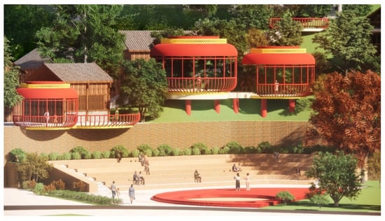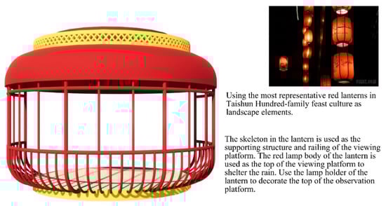 The lantern viewing platform uses the red lantern, the most representative of Taishun’s Hundred-family Feast culture, as a landscape element. The skeleton form in the lantern is used as the supporting structure and railing of the viewing platform, the red body of the lantern is used as the top of the landscape platform to shelter from the rain, and the lantern’s lamp holder is decorated on the top of the landscape platform. The whole form is combined similar to a red lantern hanging in a high place, full of good symbolic meaning (as illustrated in Figure 16).