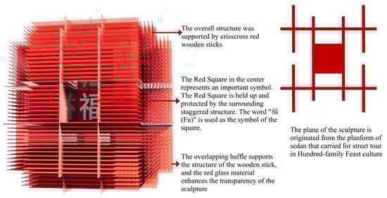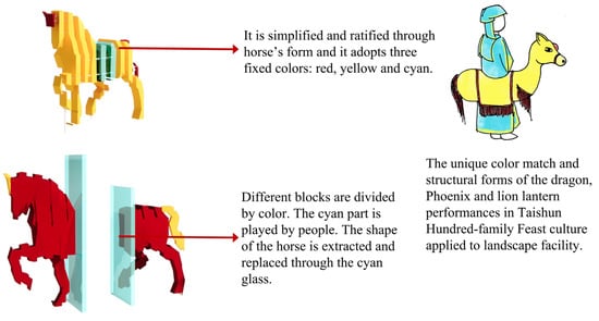 There are two landscape element carriers that were proposed in the district experience zone. The first is the Fufang sculpture. It uses the street-tour activity of the Taishun Hundred-family Feast culture, where people carry the idol in a palanquin, and the flat structure of the palanquin on wood is selected and presented in the form of a sculpture. The overall structure of the sculpture is made up of interlocking red wooden sticks, with overlapping baffles supporting the structure of the sticks and the use of red glass to enhance the permeability of the statue. The red square in the centre is held up and protected by the interlocking structures around it, which is an important symbol, and the word “fortune” is used as a symbol of the square, which better reflects the importance and representativeness of the word “fortune” in the culture of the Taishun Hundred-family Feast (as shown in Figure 19). The second is the dragon phoenix and lion lamp that derives from the lamp performance of a dragon, phoenix and lion in the Taishun Hundred-family Feast culture. It applies the unique colour scheme and structural form of the lamp to the landscape miniature, simplifying and artistically expressing the form of the horse by using the three fixed colours of red, yellow and cyan. The colours are divided into different sections, with the cyan part being played by people, from which the horse forms are extracted and replaced through the cyan glass (as shown in Figure 20).