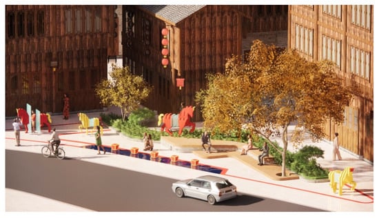 The landscape of the Hundred-family Feast culture district experience zone is mainly divided into three parts: a traffic roundabout at the intersection of Guiyan Road and Longxiang Road, a street recreation and fitness space at the convergence of Guiyan Road and Renmin Road, and a rest and play space with the dragon and phoenix lion lamp as the main expression (as illustrated in Figure 18). The landscape island and unique sculptures set the atmosphere of the street, the recreation and fitness space show the elements and contents of the culture of the Taishun Hundred-family Feast, and the rest and play space show the cultural characteristics of the dragon and phoenix lion lamps.