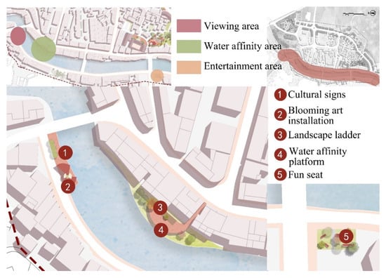 The leisure tour experience landscape is mainly divided into three parts. The first is the viewing area located on the west bank of Sankui Creek, while the second is the water-friendly activity area located on the east bank of Sankui. These two landscapes are opposite each other across the bank, and the third is the leisure and entertainment area located on the south side of the west bank of Sankui Creek (as shown in Figure 22). The viewing area shows the fireworks in Taishun’s Hundred-family Feast culture. Through the water-friendly activity area, not only locals but also tourists can enjoy the scenery on the opposite bank and get closer to the stream; through the recreation area, people can watch the scenery and play simultaneously, which indicates the leisure function on tourists [,].