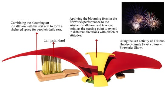 The blossoming art installation as the landscape element carrier is enlightened by the firework display, which is the last element of the Taishun Hundred-family Feast culture. The blossoming form of the firework display is applied to the art installation, taking a point as the starting point and extending it in different directions with different gestures to show the beauty of the blossoming fireworks. The colours of red and yellow are used as the representative. The blossoming art installation is connected with the resting seats to form a sheltered space, which not only enhances the ornamental aspect but also facilitates people’s daily rest (as illustrated in Figure 23). The space along the Sankui stream is mainly for natural scenery viewing. The whole landscape space is relaxed and leisurely. Compared to other landscape spaces, there is no lively activity space but more of a resting space to meet the needs of walking and resting by the stream. Along the Sankui stream, visitors can experience a different landscape space, either sitting quietly and enjoying the scenery, getting closer to the water and viewing the beautiful scenery on the opposite bank or playing in the broader area close to the stream.