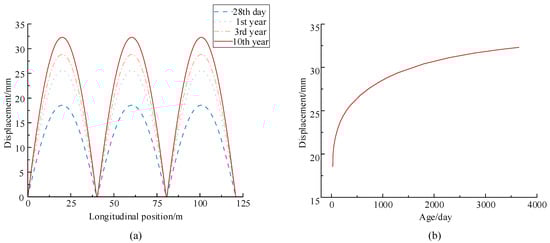 Change in vertical displacement of the composite box-girder bridge with time (a) Longitudinal distribution; (b) Change with time.