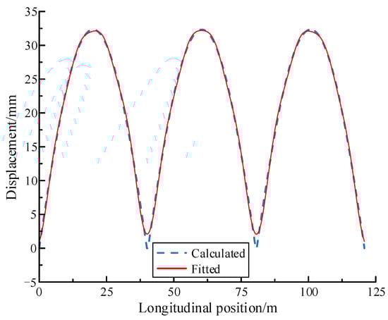 Figure 3 gives the change in vertical displacement of the composite box-girder bridge with time when the composite bridge is subjected to a dead load of self-weight and ancillary facilities. Figure 3a reflects the change in displacement distribution along the span at four time points, and Figure 3b shows the change in vertical displacement at mid-span with time. It can be observed that the vertical displacement increases with time, and the change rate diminishes with time. The increasing vertical displacement will become the new excitation of the train-bridge coupling system and amplify the dynamic responses of the system. However, there is no smooth transition of the vertical displacement at the supports between the two simply supported bridges, as shown in Figure 3a. This is not consistent with the actual case because of the existence of the track. Thus, the vertical displacement distribution curves along the span need to be fitted to be a set of smooth curves. Figure 4 shows the comparison between the calculated and the fitted displacement distribution curves at the 10th year. The fitting formula is given in Equation (1). The specific value of each coefficient in the fitting Equation (1) is given in Table 4.
