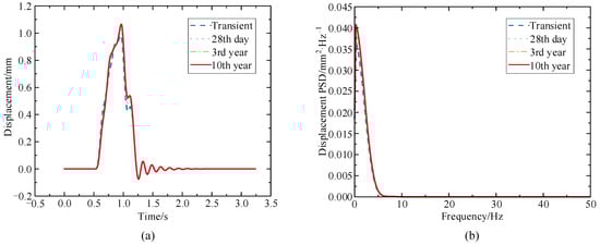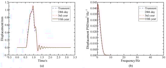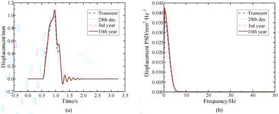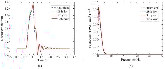 Vertical displacement of the mid-span section of the composite box-girder bridge at different operation times (a) Time history; (b) Power spectral density.