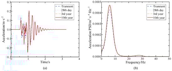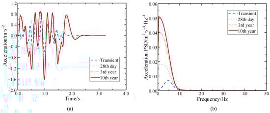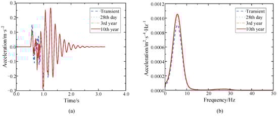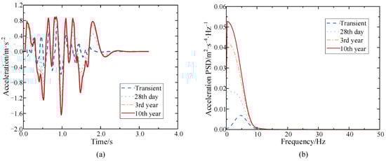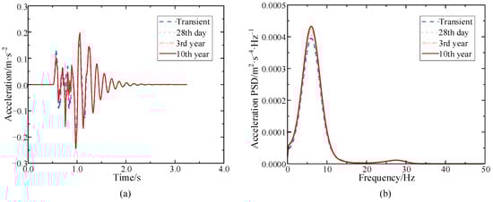 Vertical acceleration of the mid-span section of the composite box-girder bridge at different operation times (a) Time history; (b) Power spectral density.