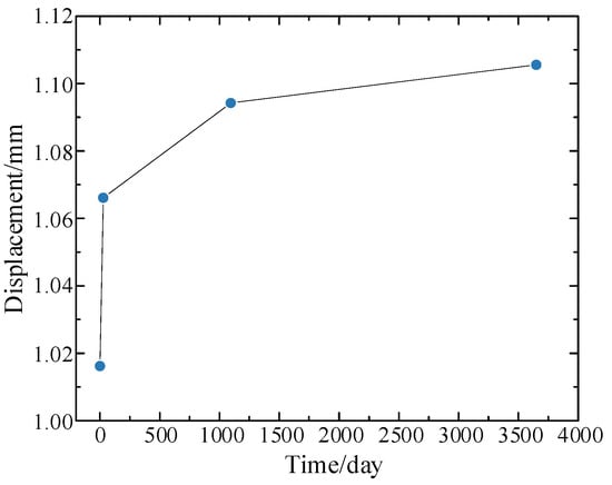 The maximum vertical displacements at the mid-span section of the composite girder bridge with various operation times.
