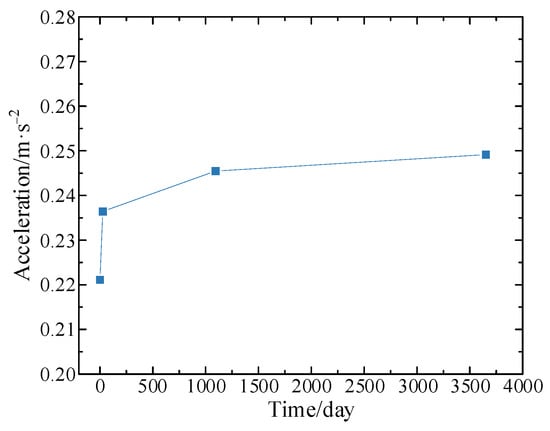 Figure 7 and Figure 8 exhibit the maximum of vertical displacement and vertical acceleration, respectively, at the mid-span of the composite box-girder bridge at different operation times within the time range as a whole when high-speed trains pass through it. The maximum vertical displacement at the mid-span of the composite bridge increases with time, from 1.02 mm in the transient case to 1.11 mm in the 10th year. The increase in the maximum of its vertical displacement slows with time. The maximum value of vertical acceleration at the mid-span of the composite bridge increases with operation time, from 0.22 m/s2 in the transient case to 0.25 m/s2 in the 10th year. The increase in vertical acceleration slows with time. The time-dependent effect increases the maximum value of vertical displacement and vertical acceleration at the mid-span of the composite box-girder bridge by 8.82% and 13.64%, respectively. Compared with the vertical displacement, the time-dependent effect imposes a greater influence on the vertical acceleration of the composite bridge.