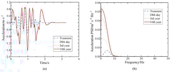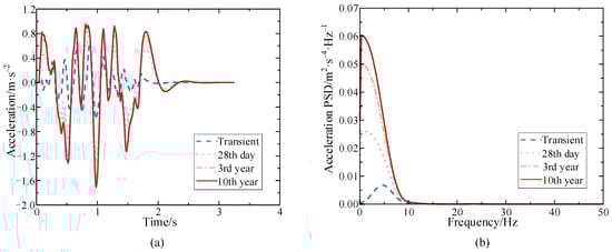 The case keeps the same as above. The responses of the vertical displacement and vertical acceleration of the composite box-girder bridge with shear connection stiffness ρsh = 1 kN/mm2 in the transient case, 28th day, 3rd year and 10th year are illustrated in Figure 11 and Figure 12, respectively. The dynamic responses such as the vertical displacement and acceleration of the composite box-girder bridge with shear connection stiffness ρsh = 100 kN/mm2 at the transient time, 28th day, 3rd year and 10th year are illustrated in Figure 13 and Figure 14, respectively. The maximum vertical displacement and vertical acceleration curves at different operation times are illustrated in Figure 15 and Figure 16, respectively.
