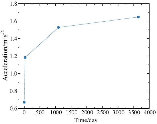 The composite box-girder bridge–train coupling system is a coupling system. The analysis in Section 2.1 has revealed that the time-dependent effect has a significant impact on the dynamic responses of the composite box-girder bridge. It can be predicted that the time-dependent effect is bound to impose a significant influence on the dynamic responses of the train. In this paper, the vertical acceleration of the train body is selected. When one carriage of the CRH2 high-speed train passes through the composite box-girder bridge with transient operation times including the 28th day, 3rd year and 10th year at a speed of 300 km/h, the vertical acceleration of the train body in the time history and frequency domain are summarized in Figure 9, and the maximum values of the vertical acceleration of the train body at different operation times are summarized in Figure 10. The characteristic frequency of train vertical acceleration is slightly different under different operation time conditions. The frequency is 4.62 Hz in the transient case, 1.54 Hz on the 28th day, and 0.31 Hz at the 3rd and 10th years. The change in time will have an impact on the distribution of the train’s characteristic frequency. The dynamic response increases more significantly with time compared with the characteristic frequency. As illustrated in Figure 10, the maximum vertical acceleration of the train body increases with operation time, going from 0.67 m/s2 in the instantaneous case to 1.64 m/s2 in the 10th year. The increase in amplitude slows with increasing operation time. The time-dependent effect will increase the maximum vertical acceleration of the train by 144.78% from the transient case to the 10th year.