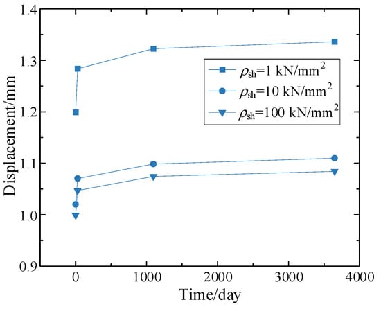 From the results, the increase in shear connection stiffness reduces the vertical displacement amplitude of the steel–concrete composite beam at different operation times but will not affect the trend that the growth rate slows with increasing operation time. When the shear connection stiffnesses of the composite box-girder bridge are ρsh = 1 kN/mm2, ρsh = 10 kN/mm2 and ρsh = 100 kN/mm2, the mid-span vertical displacements in the 10th year are 1.34 mm, 1.11 mm and 1.08 mm, respectively; At the transient time, the mid-span vertical displacements are 1.20 mm, 1.02 mm and 1.00 mm. The data in the frequency domain in Figure 5, Figure 11 and Figure 13 reveal that the slip does not influence the distribution of the vertical displacement characteristic frequency under the time-dependent behavior of the steel-concrete composite box-girder bridge. When the shear connection stiffnesses are ρsh = 1 kN/mm2, ρsh = 10 kN/mm2 and ρsh = 100 kN/mm2, the characteristic frequencies relative to the vertical displacement are equivalent at different operation times, that is, the slip does not change the characteristic frequency relative to the vertical displacement at the mid-span of the composite box-girder bridge. However, it is notable that the slip does affect the maximum value of dynamic responses.