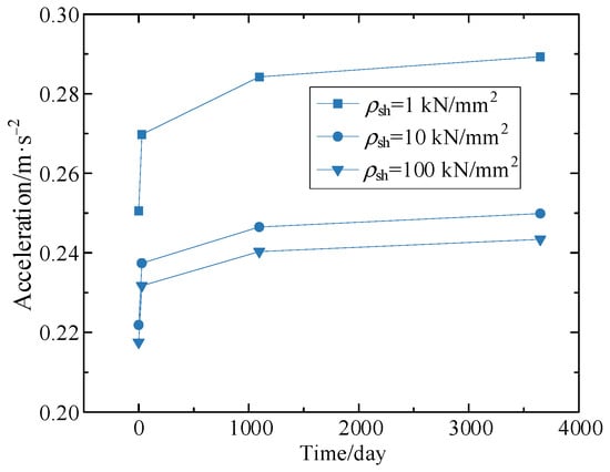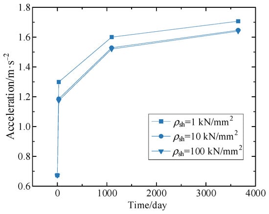 From the vertical acceleration results, the increase in the train-body shear connection stiffness slightly reduces the dynamic response amplitude but will not affect the trend that the growth rate slows with increasing operation time. When the shear connection stiffnesses of the composite box-girder bridge are ρsh = 1 kN/mm2, ρsh = 10 kN/mm2, and ρsh = 100 kN/mm2, the vertical accelerations of the train body in the 10th year are 1.71 m/s2, 1.65 m/s2, and 1.64 m/s2, respectively; for the instantaneous case, the vertical accelerations of the train body are 0.68 m/s2, 0.67 m/s2, and 0.67 m/s2, respectively. The results in the frequency domain in Figure 9, Figure 17 and Figure 18 reveal that when the shear connection stiffnesses are ρsh = 1 kN/mm2, ρsh = 10 kN/mm2 and ρsh = 100 kN/mm2, respectively, the characteristic frequencies relative to the vertical acceleration do not change (refer to Table 7). The existence of slip does not change the distribution of the characteristic frequencies relative to the train vertical accelerations under the time-dependent effect. However, note that the existence of slip affects the dynamic response value, which decreases with increasing interface connection stiffness.