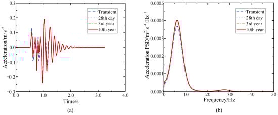 Vertical acceleration of the train at different operation times (a) Time history; (b) Power spectral density.