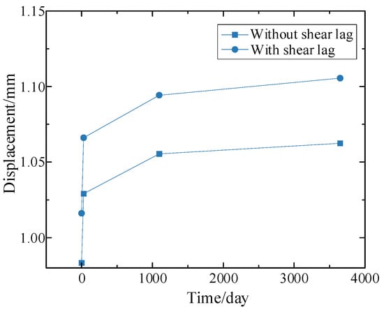 Maximum vertical displacements of the composite bridge without considering the shear lag effect with operation times.
